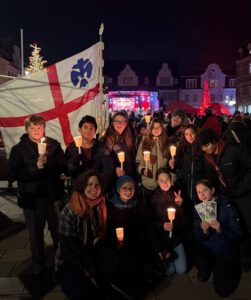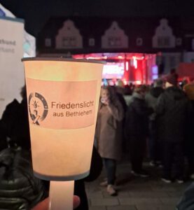 Am Mittwoch, den 17.12.2025 haben wir außerdem auch das Friedenslicht aus Bethlehem in der Fußgängerzone in Bad Kreuznach verteilt. Dazu durften wir uns auf der Bühne der Antenne KH ankündigen, die nun schon im zweiten Jahr das Weihnachtssingen auf dem Kornmarkt veranstaltet hat. Unglaubliche 700 Kerzen haben wir verschenkt und so ein Stück Frieden in 700 Häuser, Wohnungen und Familien gebracht.